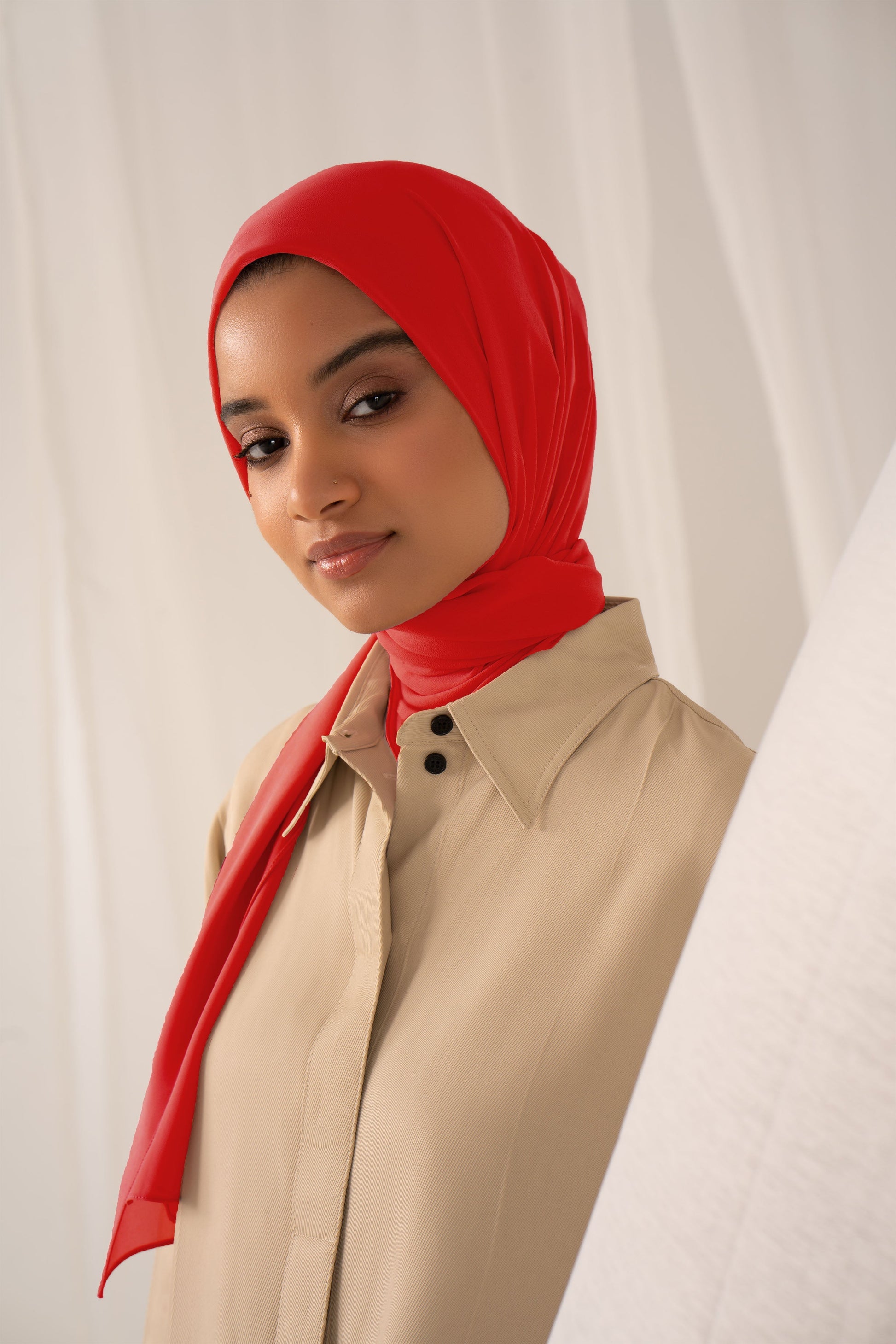 The fabric that started it all.Our signature chiffon is light, crisp and easy to care for, giving you a sleek, polished look every time. It features a rich cherry red hue that's gorgeous on any skin tone.